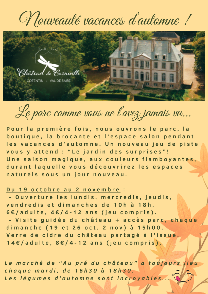 * Info météo/vents : L'ouverture pour les vacances d'automne est malheureusement reportée ! Les vents annoncés ne nous permettent pas d'ouvrir en toute sécurité. Les arbres sont encore feuillus, le poids des branches est donc conséquent. Un coup de vent de plus de 70km/h est dangereux pour les promeneurs. Nous resterons donc fermés dimanche 19 et lundi 20 octobre. Nous étudierons ensuite la faisabilité d'une réouverture en fonction des prévisions à trois jours.